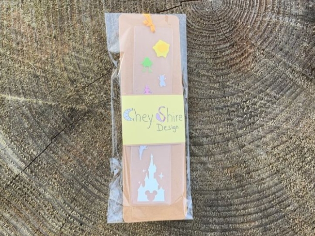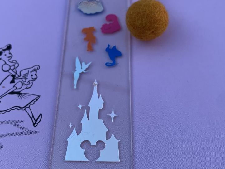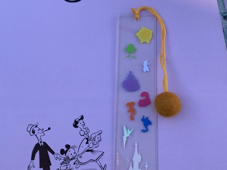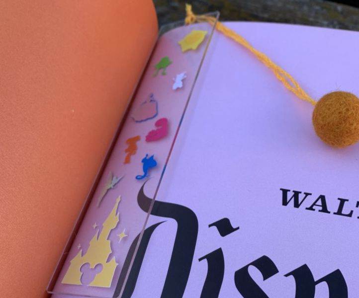 Marque-page en plexiglas avec design en papier avec plusieurs détail de l'univers cinématographique de Disney